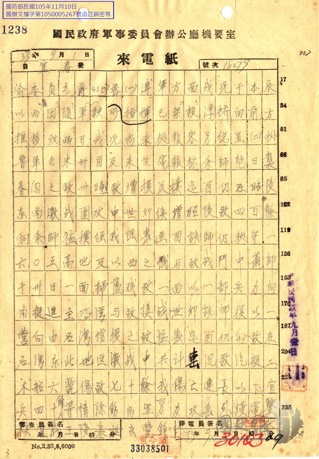 王陵基電蔣中正一八三師襲擊春瀾現仍據守一六○五高地及其以西之線與敵戰鬥中另新十師現仍在石灣東北地區激戰中等情已飭努力攻擊