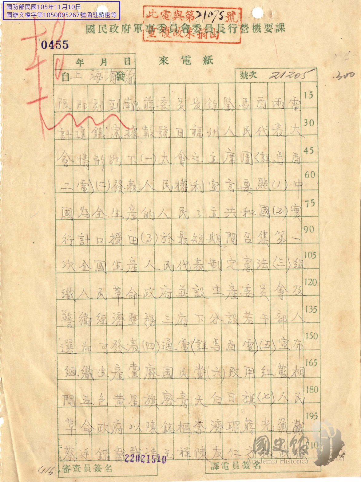 吳鐵城電蔣中正轉報二十日福州人民代表大會發表人民權利宣言要點組織人民革命政府設生產委員會警衛經濟政務三府及改用旗幟各軍改稱人民革命軍等會議情形