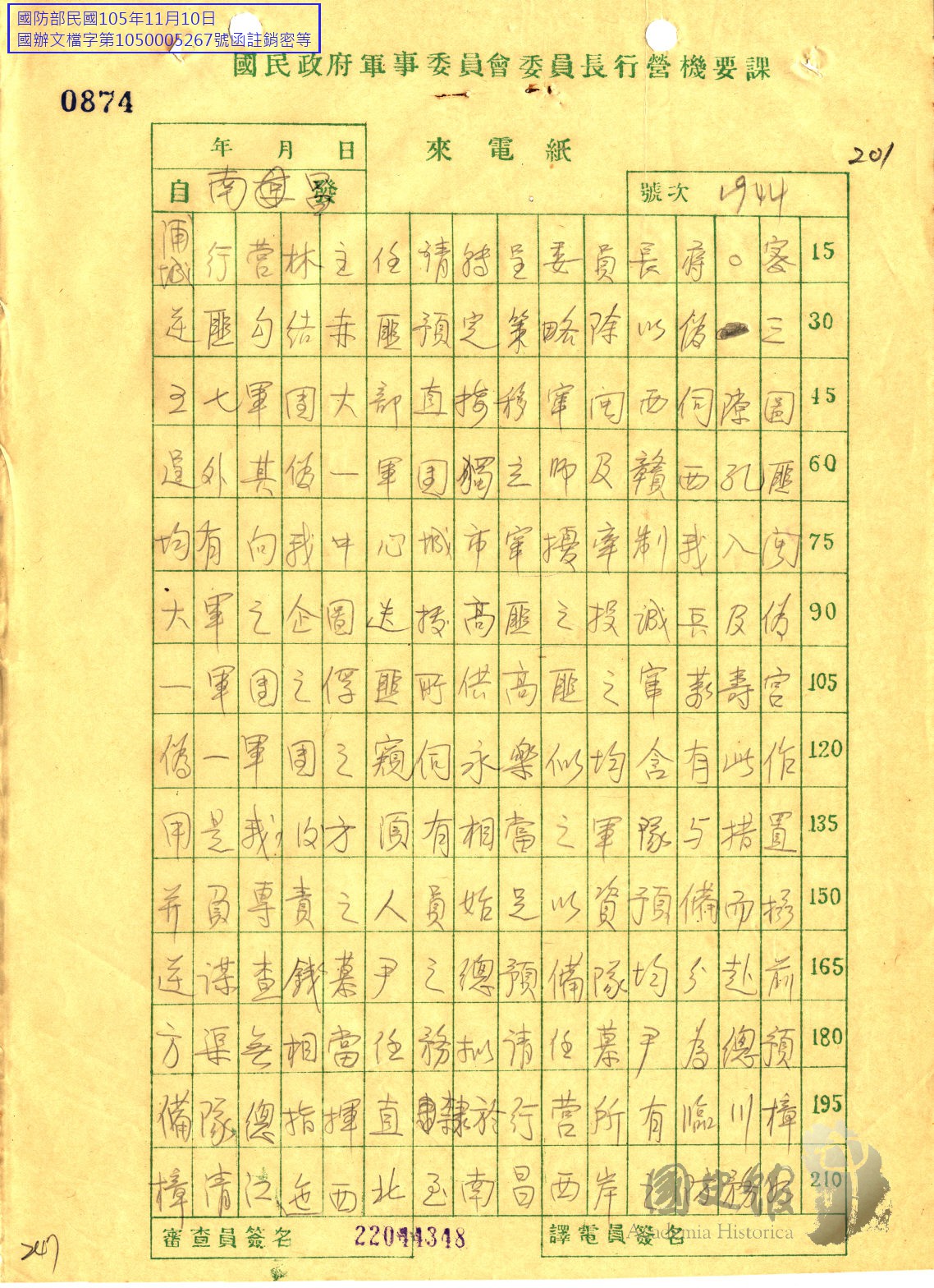 賀國光電林蔚轉蔣中正逆共勾結之預定策略致使我後方需有相當軍隊與措置及請任錢大鈞為總預備隊總指揮負責臨川至南昌之防務商承西北兩路總司令辦理