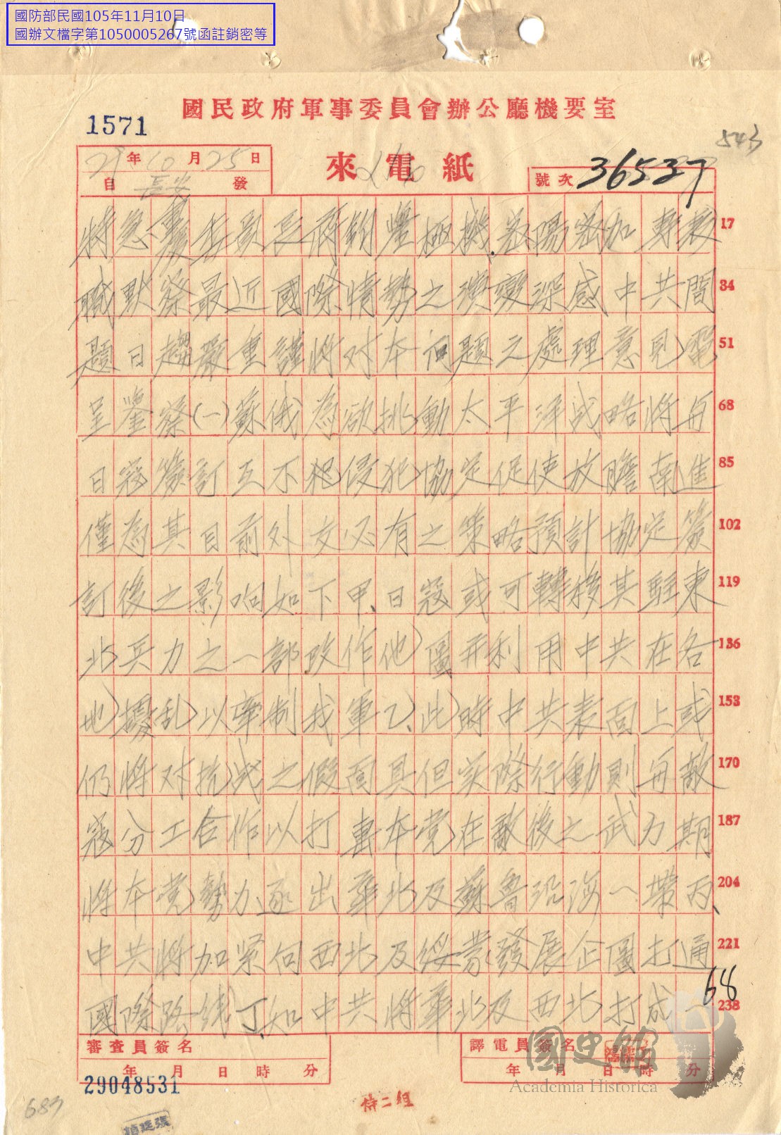 谷正鼎電蔣中正中共問題嚴重本黨對策首要為使各軍政長官明瞭中共行動均為預定方策應嚴防並在軍事採主動控制及加強宣傳並在後方各省肅清中共潛伏勢力等