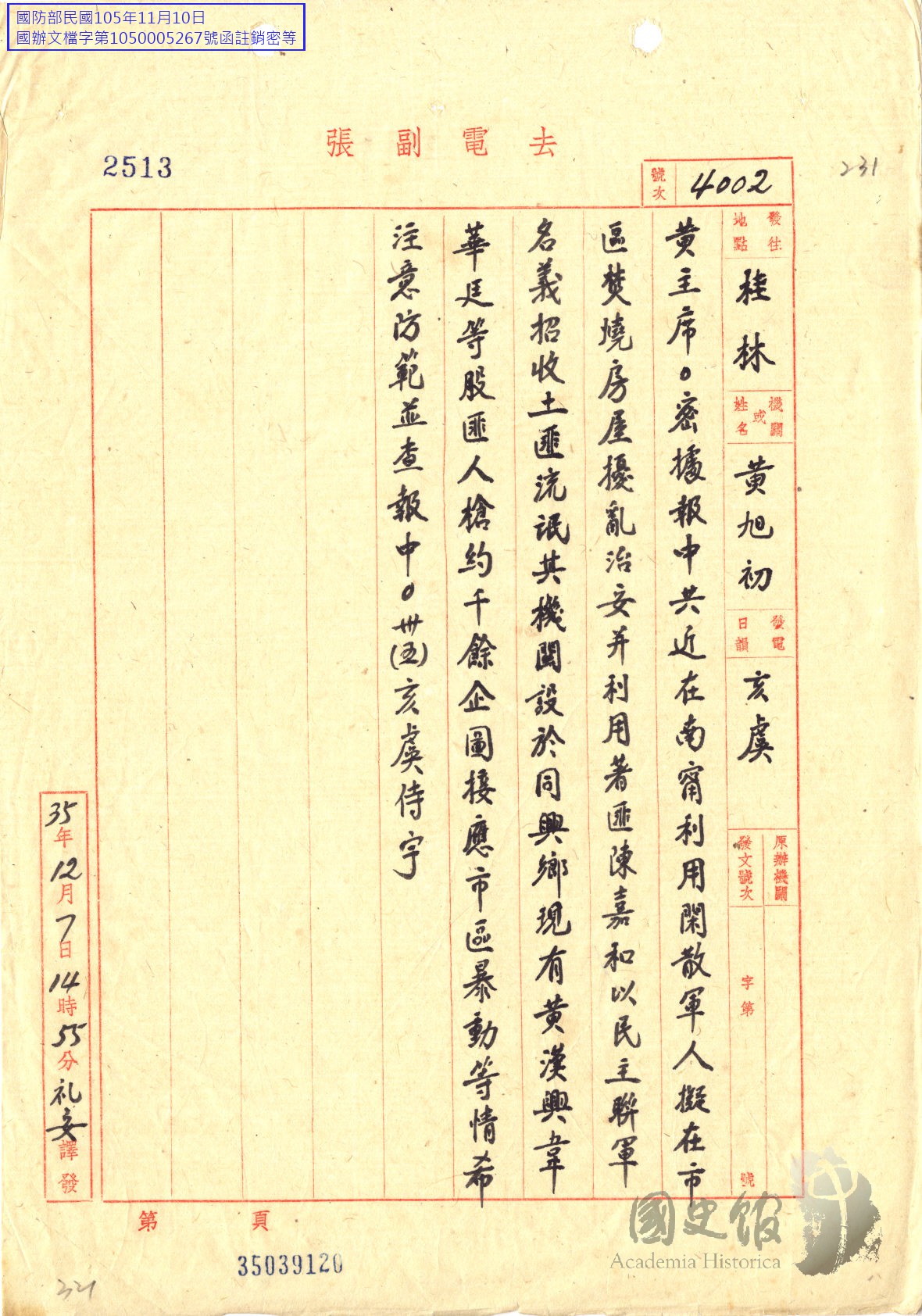 蔣中正電黃旭初據報中共擬利用閒散軍人在南寧市區焚毀房屋擾亂治安並利用匪陳嘉和以民主聯軍名義招收土匪製造暴動請注意防範並查報