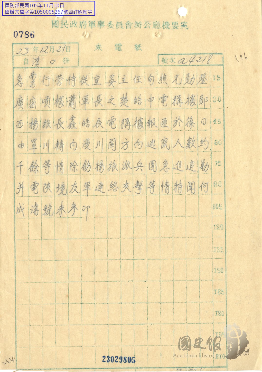 何成濬電晏道剛據蕭之楚電稱匪由罩川轉向漫川關方向逃竄人數約千餘已飭楊鑫派兵急進追剿並電陝境友軍聯絡夾擊