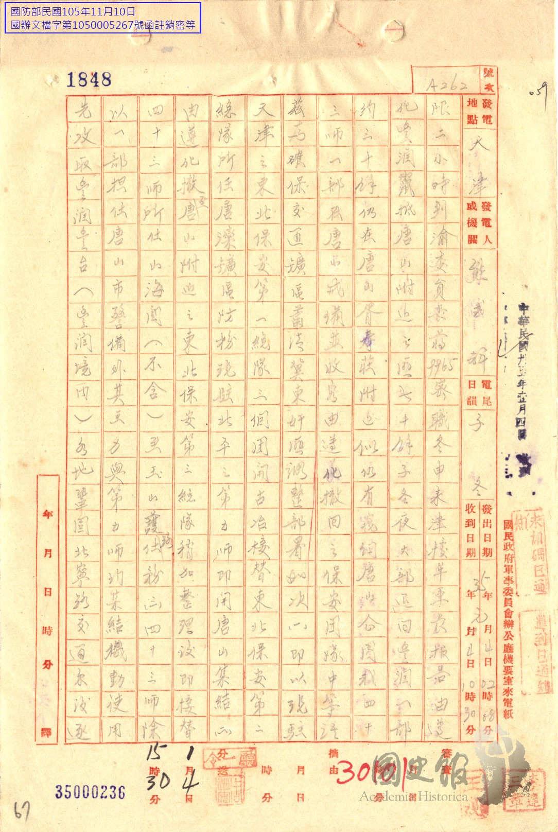 熊式輝電蔣中正據牟廷芳報稱匪由遵化豐潤圖竄唐山現為保全交通礦區擬令東北保安第一總隊接替唐灤礦區防務第三總隊接替山海關至玉山護路任務等情
