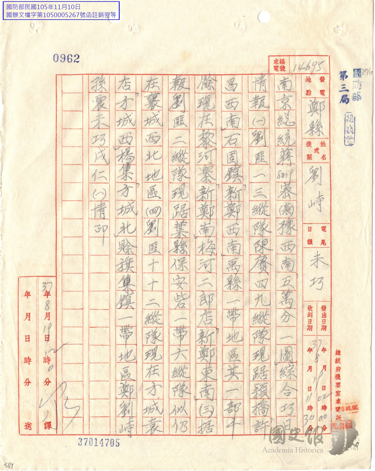 劉峙孫震電蔣中正稱劉匪第一第三縱隊陳賡第四第九縱隊據穎橋許昌西南石固鎮禹縣一帶地區其一部在黎河寨梅河二郎店等