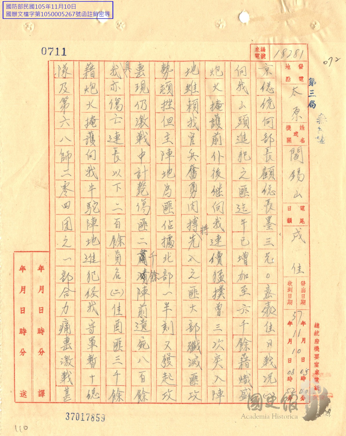 閻錫山電蔣中正何應欽顧祝同稱進犯山頭陣地主陣地為匪占據及匪軍進犯牛駝陣地由守軍暫編第十總隊與第六十八師第二○四團合力痛擊中