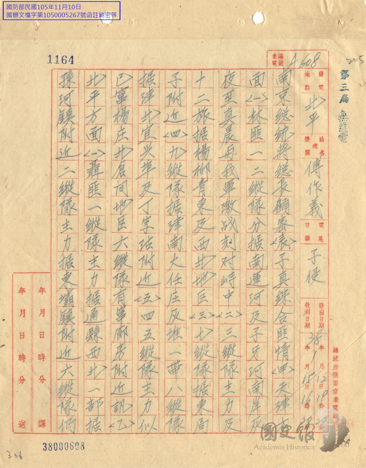 傅作義電蔣中正顧祝同稱匪林彪第一第二縱隊分據南運河和子牙河南岸與我軍激戰對峙中其第三縱隊主力和第十二旅據楊柳青附近等