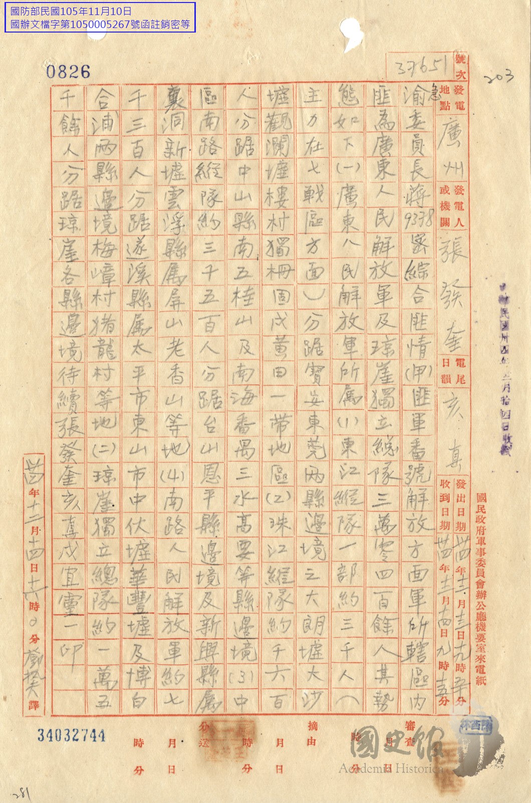 張發奎電蔣中正稱廣東人民解放軍所屬東江縱隊珠江縱隊等部各數千人分據寶安中山等處及瓊崖獨立總隊約萬餘人分據瓊崖各縣邊境