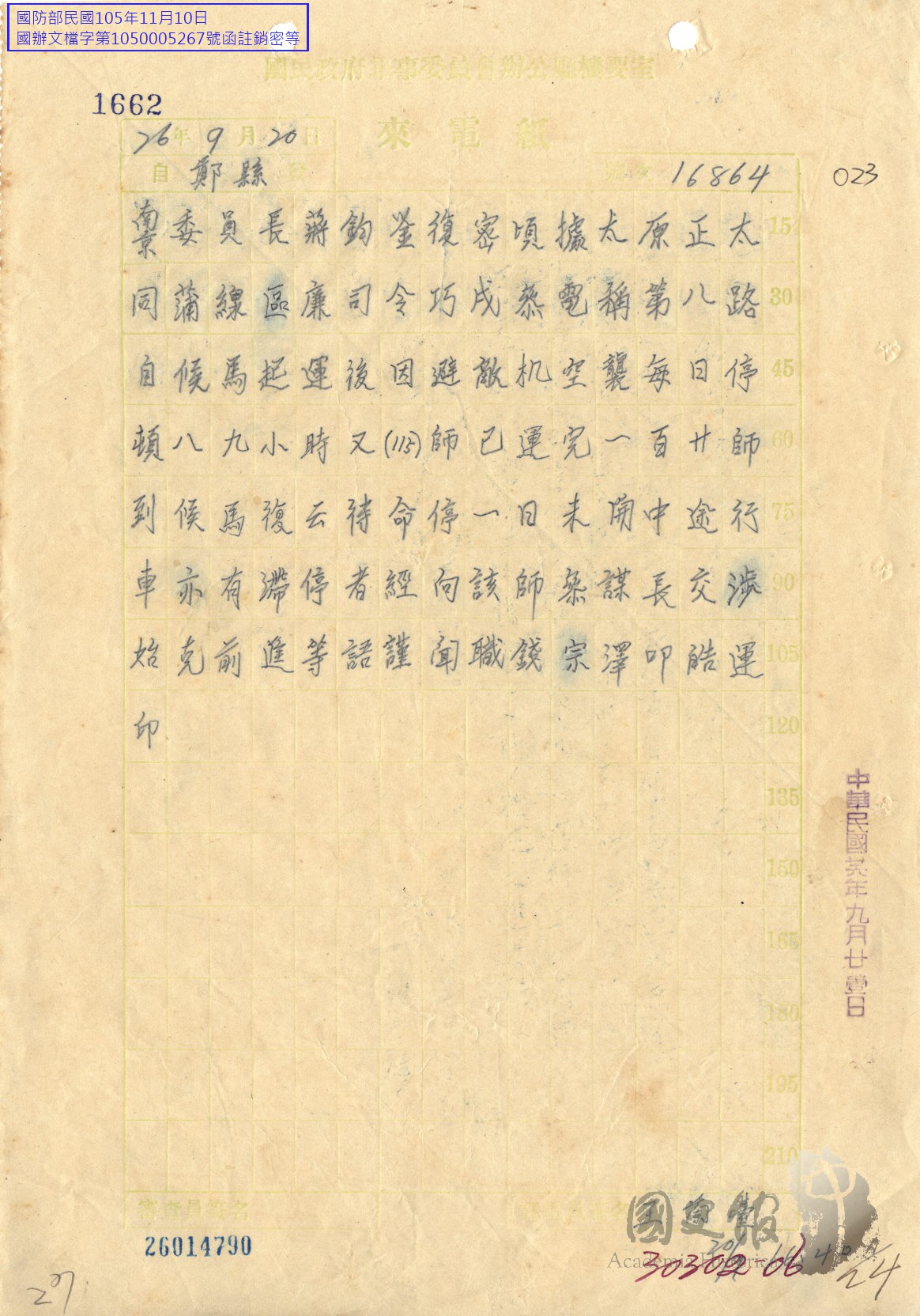 錢宗澤電蔣中正據廉司令稱八路軍自候馬起運因避敵機空襲每日停頓八九小時又一一五師已運完一二○師到候馬待命停開途中有滯停者已向該師參謀長交涉始前進