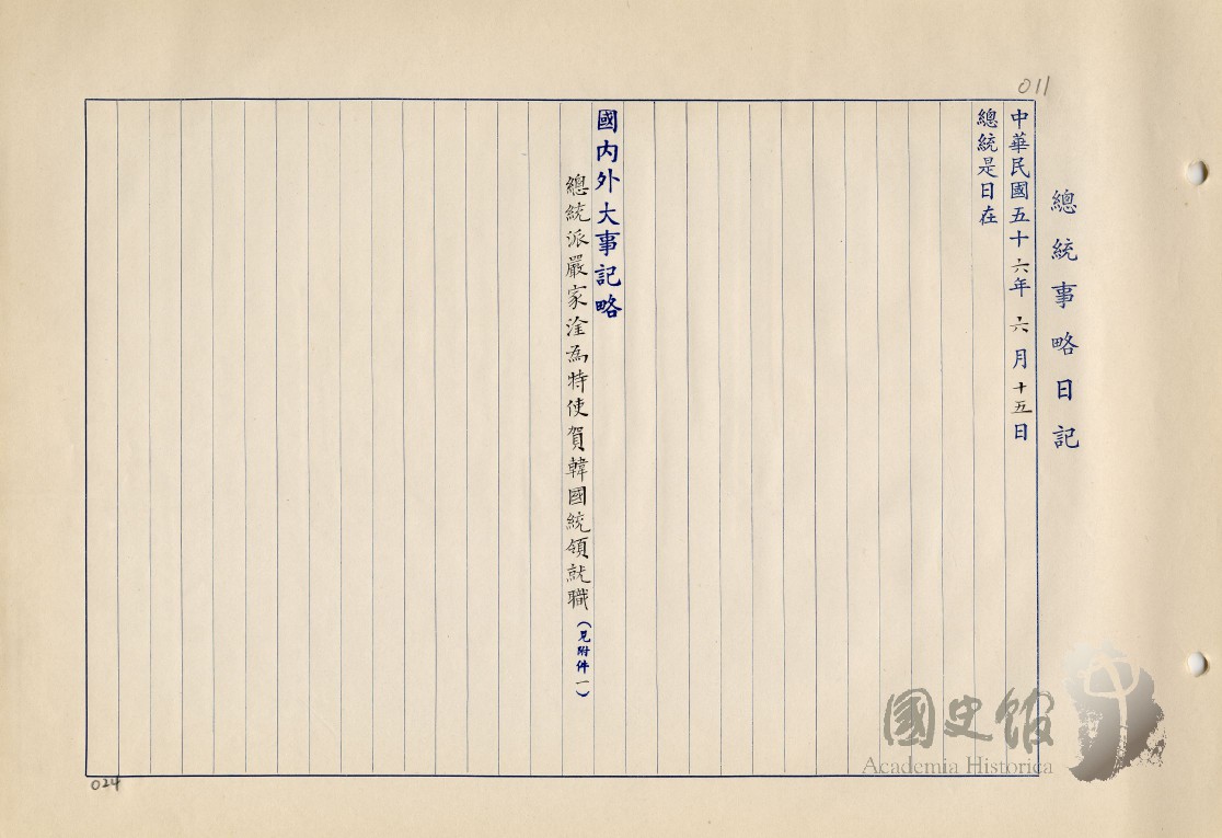 總統{#蔣中正#}派副總統{#嚴家淦#}為中華民國慶賀韓國大統領{#朴正熙#}就職典禮特使