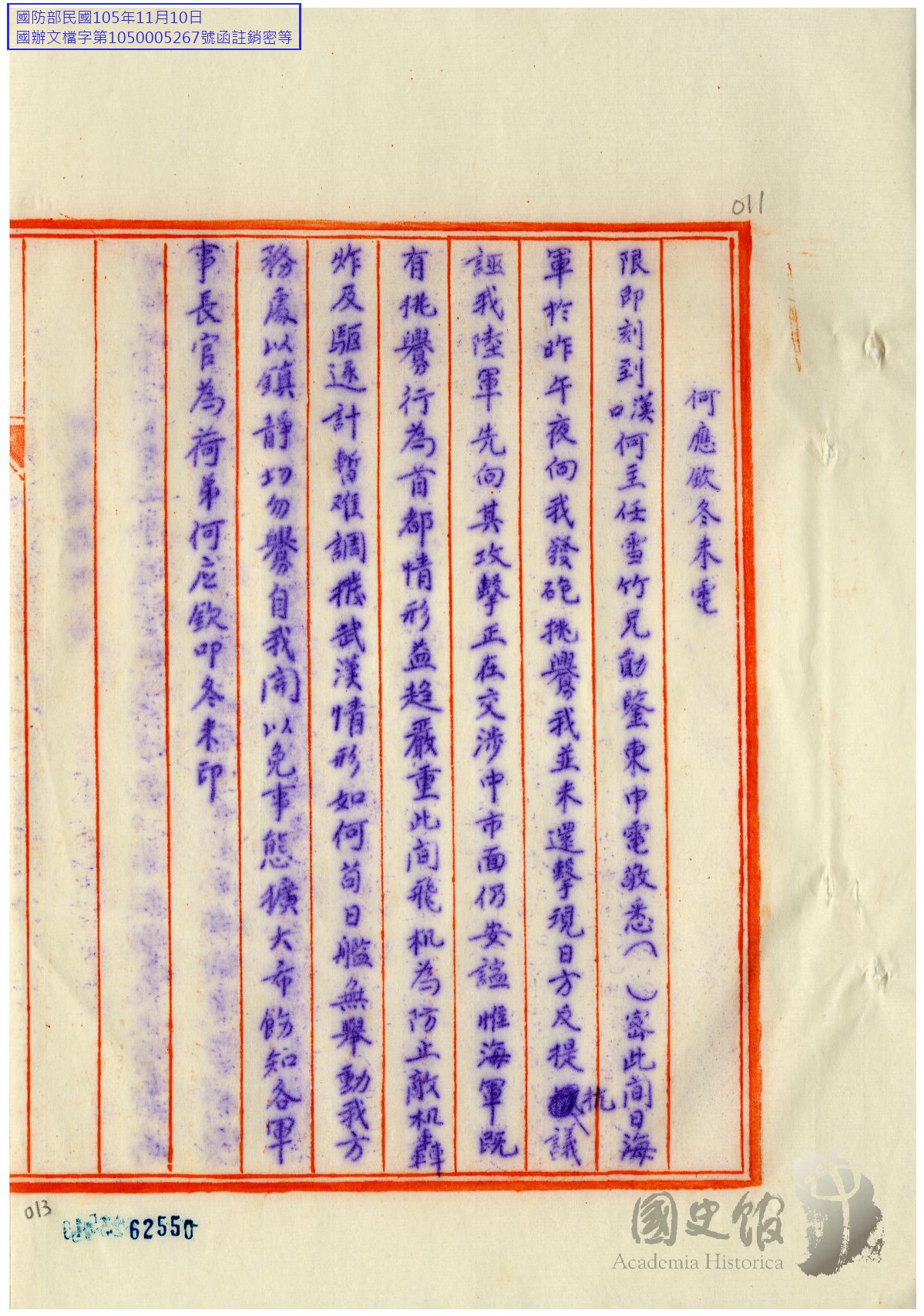 何應欽電何成濬日海軍一日午夜向我發砲挑釁日方反提抗議誣我先向其攻擊正交涉中惟其既有挑釁行為首都情形益趨嚴重此間飛機為防止敵機轟炸及驅逐計暫難調撥