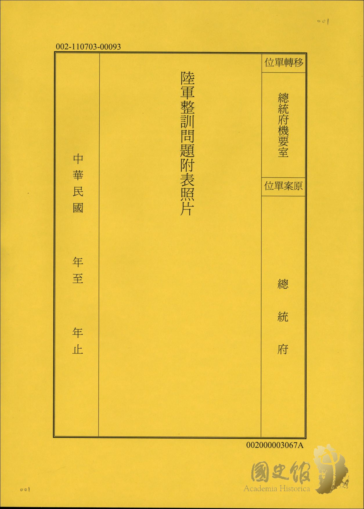 陸軍整訓概見表、陸軍軍官教育階層體系表、陸軍官兵人數統計圖、留美軍官人數統計表、陸軍部隊年度訓練及成果等表件