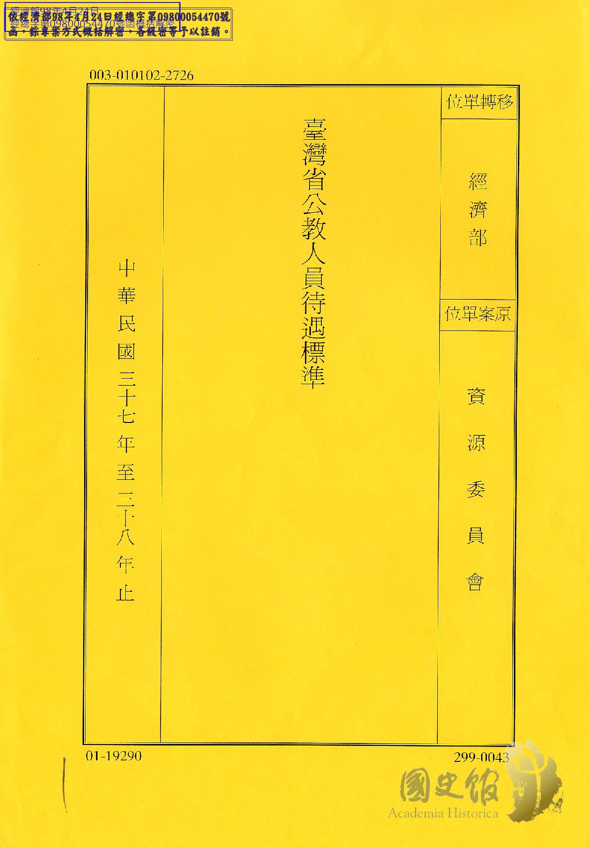 資源委員會電台灣辦事處台灣省政府三十七年一月份五月份暨九月份調整公務員待遇辦法及薪津表業經行政院准予備案抄發調整薪津表仰知照至於在台會屬單位職員待遇仍准暫照本會核定辦法辦理