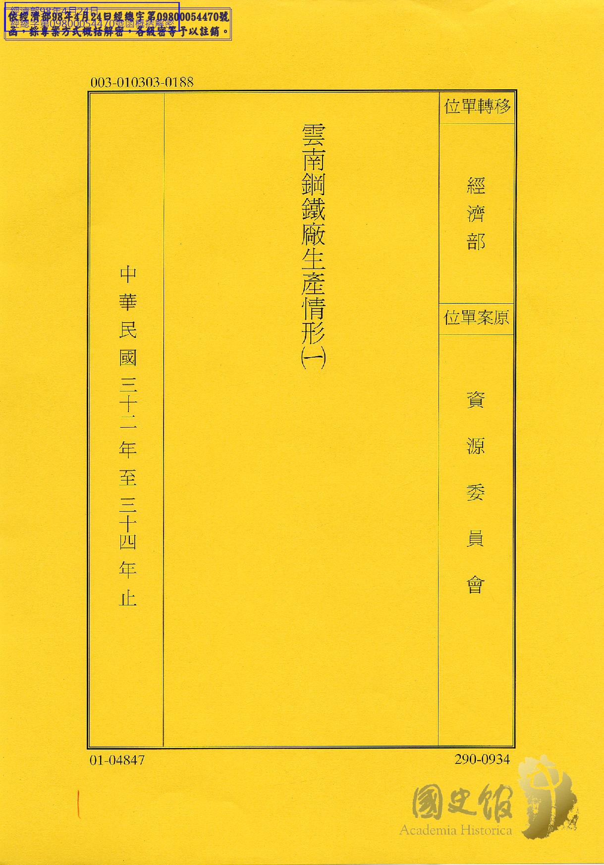 雲南鋼鐵廠工程處電煉鐵爐已開工祈蒞臨指導及電復煉鐵廠開工情形尚稱順利與每日產鐵頓數和須款情形,雲南鋼鐵廠工程處呈煉鐵爐最近出品情形並懇墊發三百萬元以資接濟並經寄發支票一幣令查明具報,雲南鋼鐵廠電以生鐵銷路呆滯存貨過多擬停止煉鐵並經理事會討論通過,資源委員會令雲南鋼鐵廠改善低碳鋼錠品質擬具具體辦法及令中央電工器材廠在雲南鋼鐵廠改善低碳鋼錠品質前代為鍛鍊鋼錠,資源委員會電雲南鋼鐵處{#嚴恩棫#}請隨時斟酌經濟情形停止鍛鍊不必俟原料用罄生產局方面續購生鐵希望甚少工貸或可酌予接濟