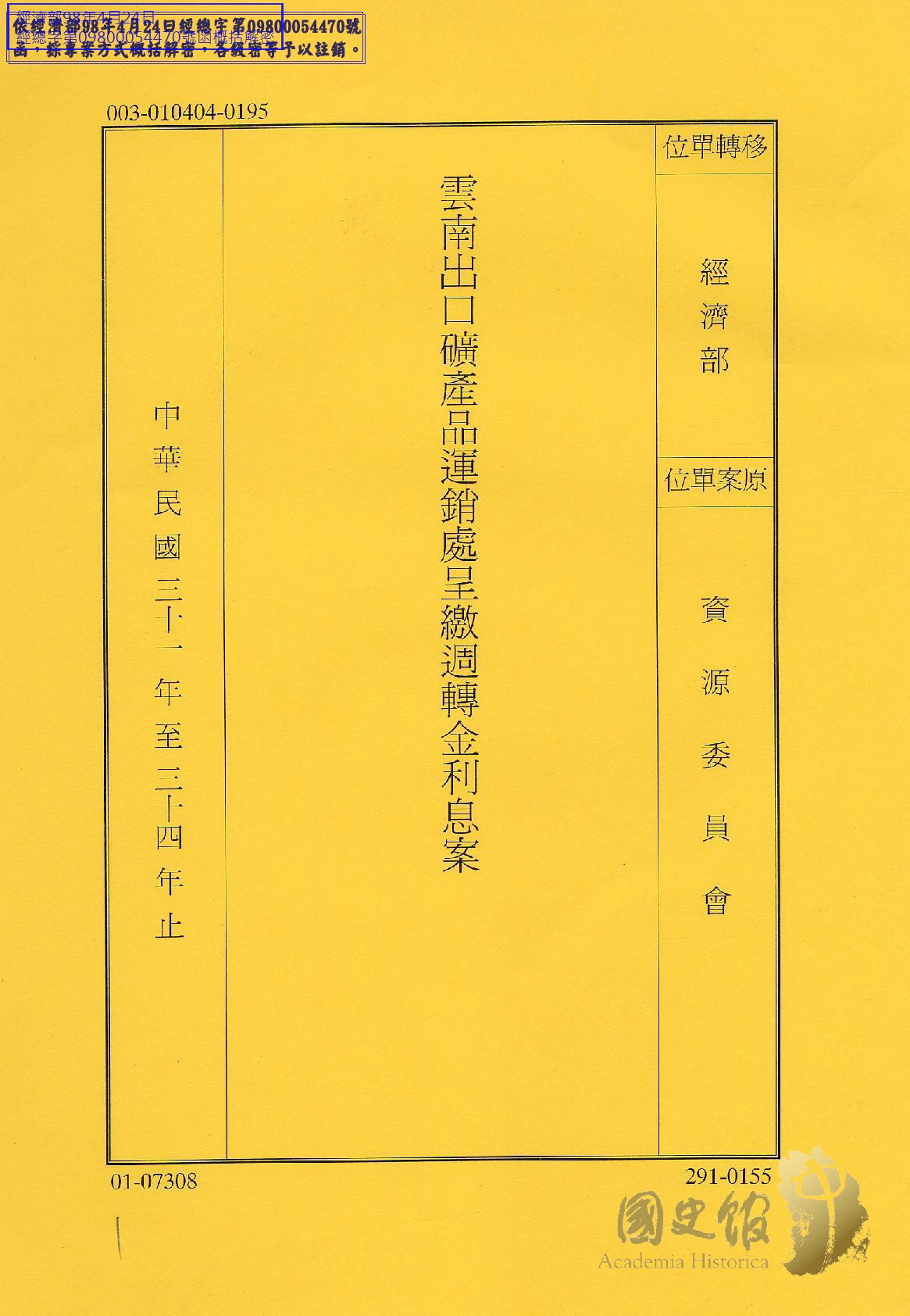 雲南出口礦產品運銷處週轉金戶欠歷期週轉金利息十九萬一千九百餘元遂如數撥存昆明中央銀行資源委員會戶頭並呈送歷期週轉金利息送金單及繳款書等