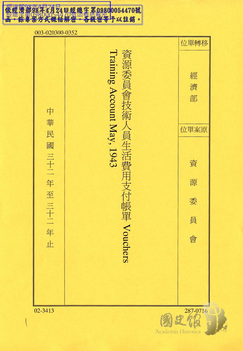 資源委員會技術人員生活費用支付帳單Vouchers Training Account