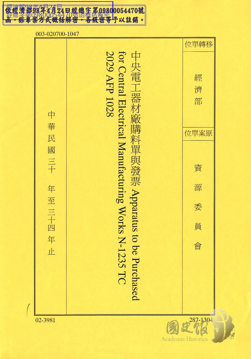 中央電工器材廠購料單與發票Apparatus to be Purchased for Cent