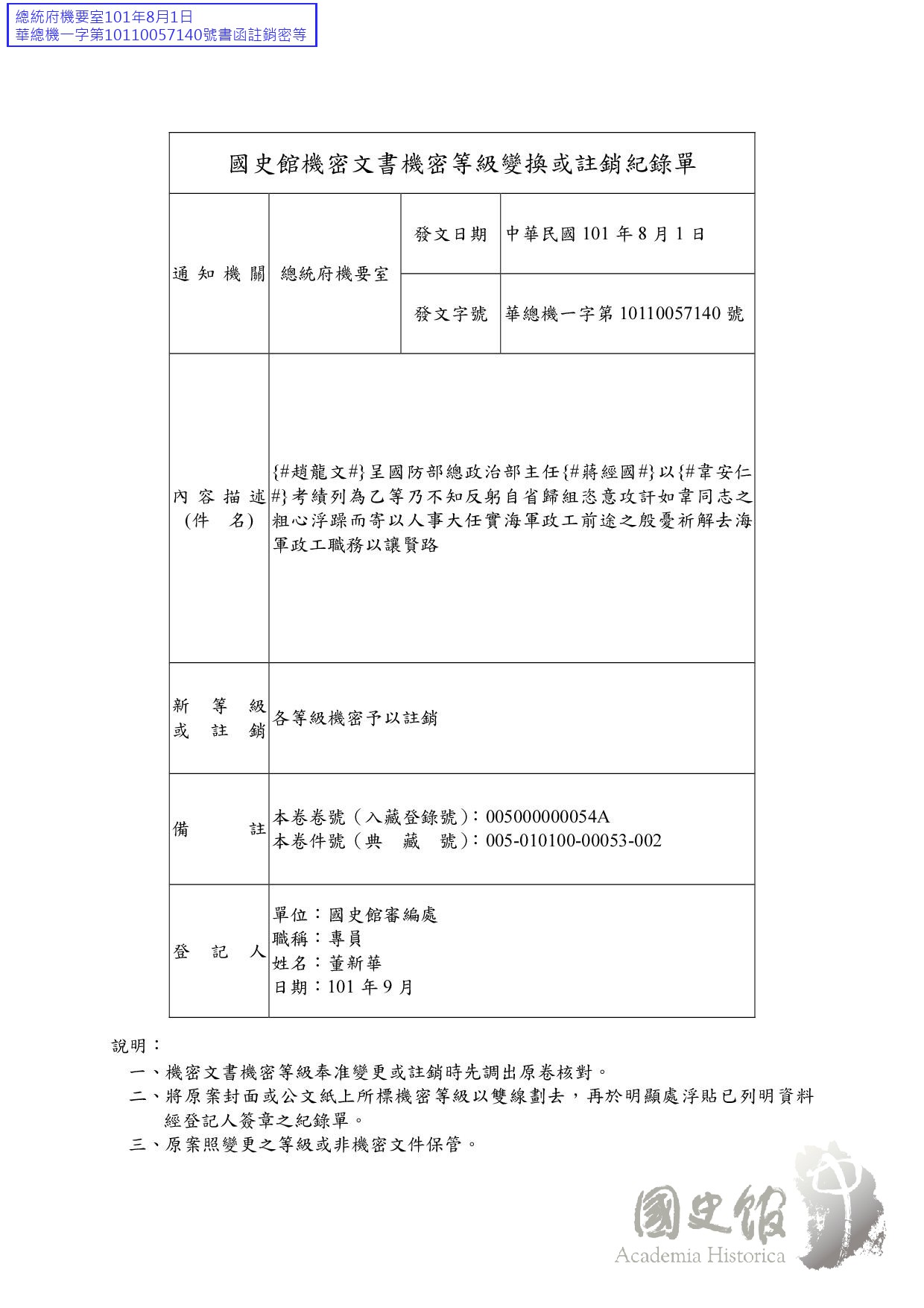 趙龍文呈蔣經國以韋安仁考績列為乙等乃不知反躬自省恣意攻訐如韋同志之粗心浮躁而寄以人事大任實海軍政工前途之殷憂祈解除其海軍政工職務