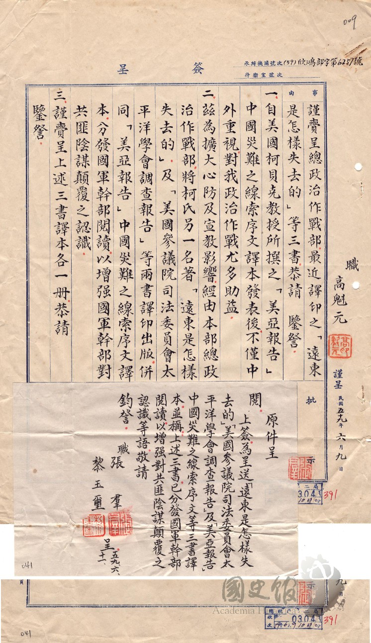 高魁元呈總政治作戰部譯印之遠東是怎樣失去的與美國參議院司法委員會太平洋學會調查報告及美亞報告中國災難之線索序文三書
