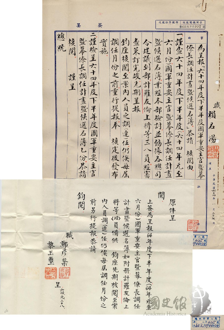 賴名湯呈蔣中正民國六十四年下半年度國軍重要主官暨幕僚長調任計畫及候選名簿經國防部檢討審查完竣奉請核定後發布實施