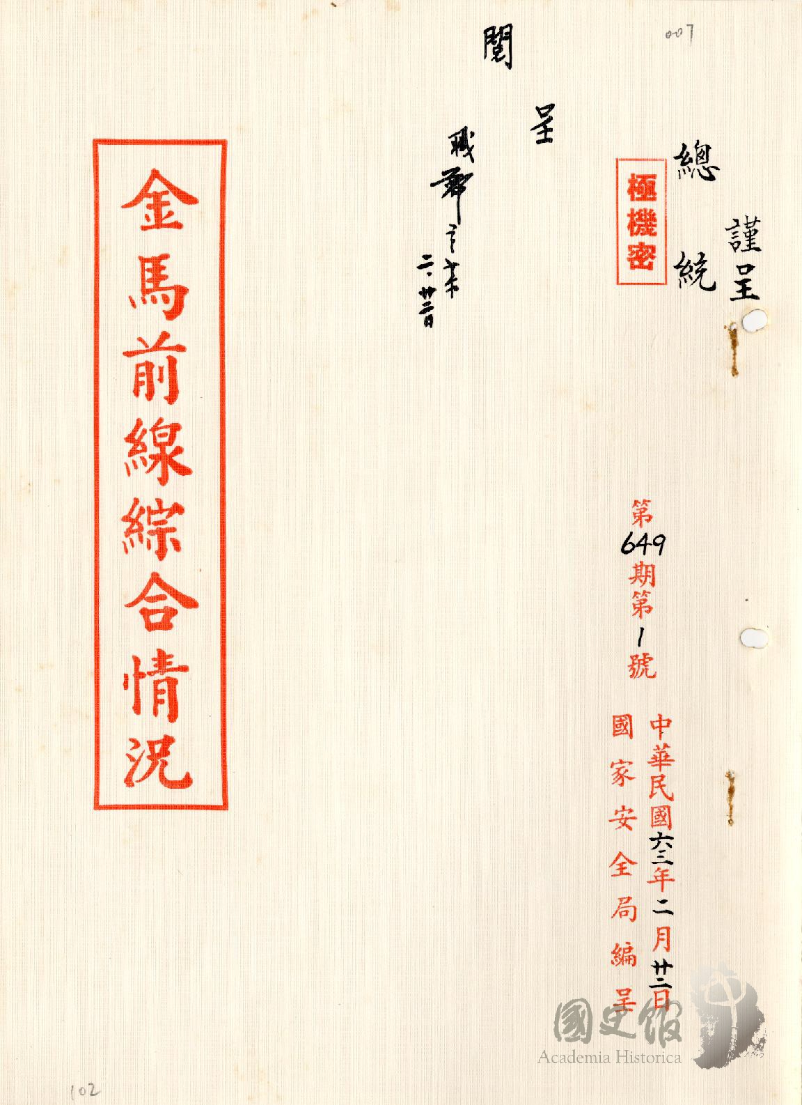 鄭彥棻呈蔣中正民國六十三年二月十三日至二月二十日金馬前線綜合情況