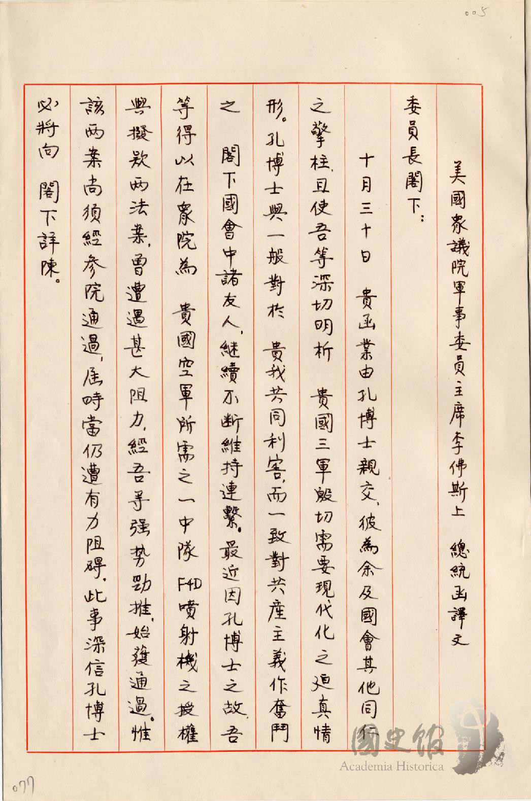 美國眾議院軍事委員會主席門德爾李佛斯函蔣中正對中華民國空軍所需噴射機授權與撥款法案經過強勢勁推始獲通過等