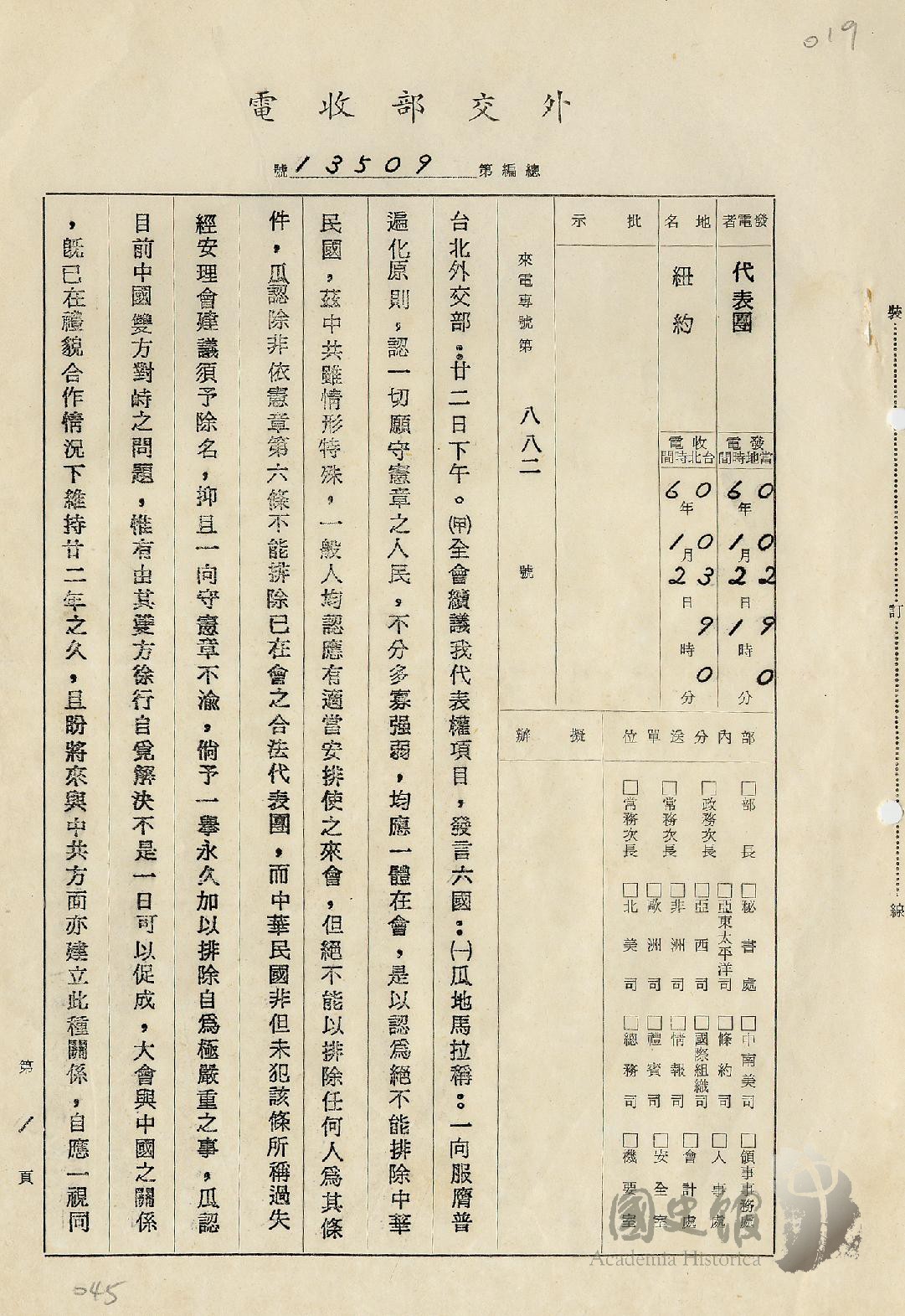 常駐聯合國代表團電外交部聯合國全會續議我代表權項目瓜地馬拉稱絕不能排除中華民國及蘇丹稱雙重代表案是干涉中國內政有違憲章等
