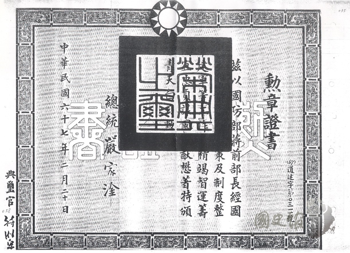 嚴家淦因蔣經國在國防部長任內勳猷懋著頒給青天白日勳章證書