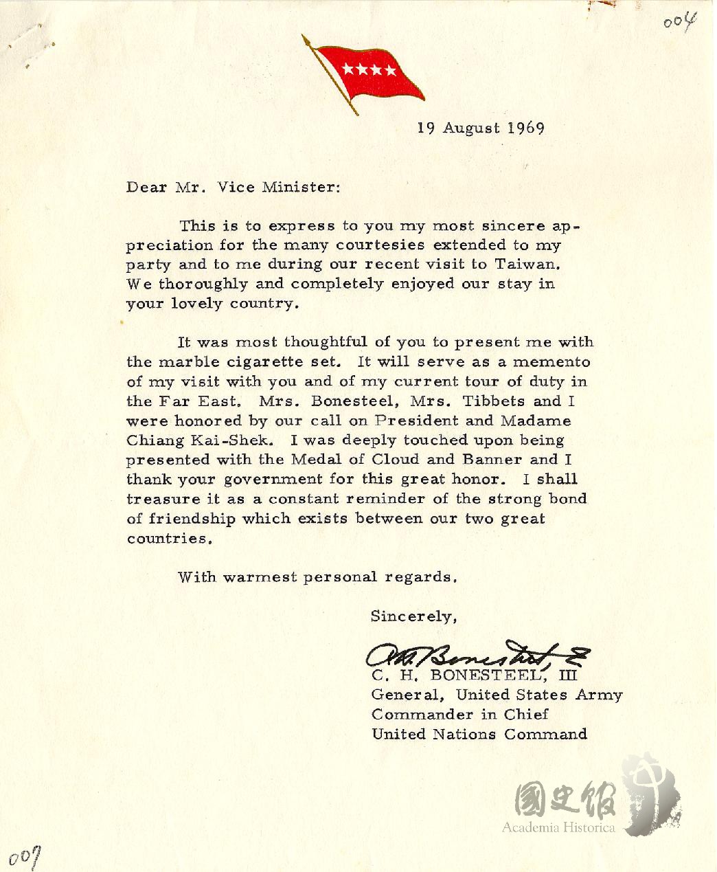 駐韓聯軍統帥彭斯第函謝蔣經國贈送其禮品並授與雲麾勳章另對拜會蔣中正宋美齡一事甚感榮幸