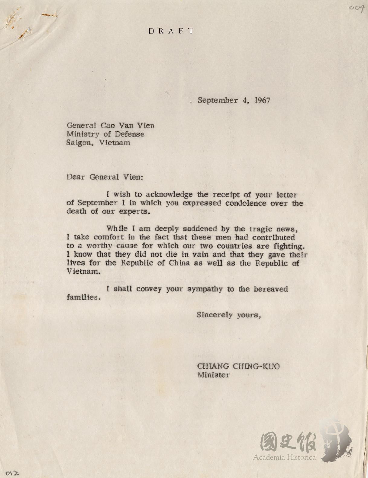 蔣經國函越南國防部部長兼參謀總長高文圓聽聞此新聞甚為憂傷惟這些受難者是為中越二國捐軀其犧牲將不會徒然並將其弔唁轉致受難者家屬