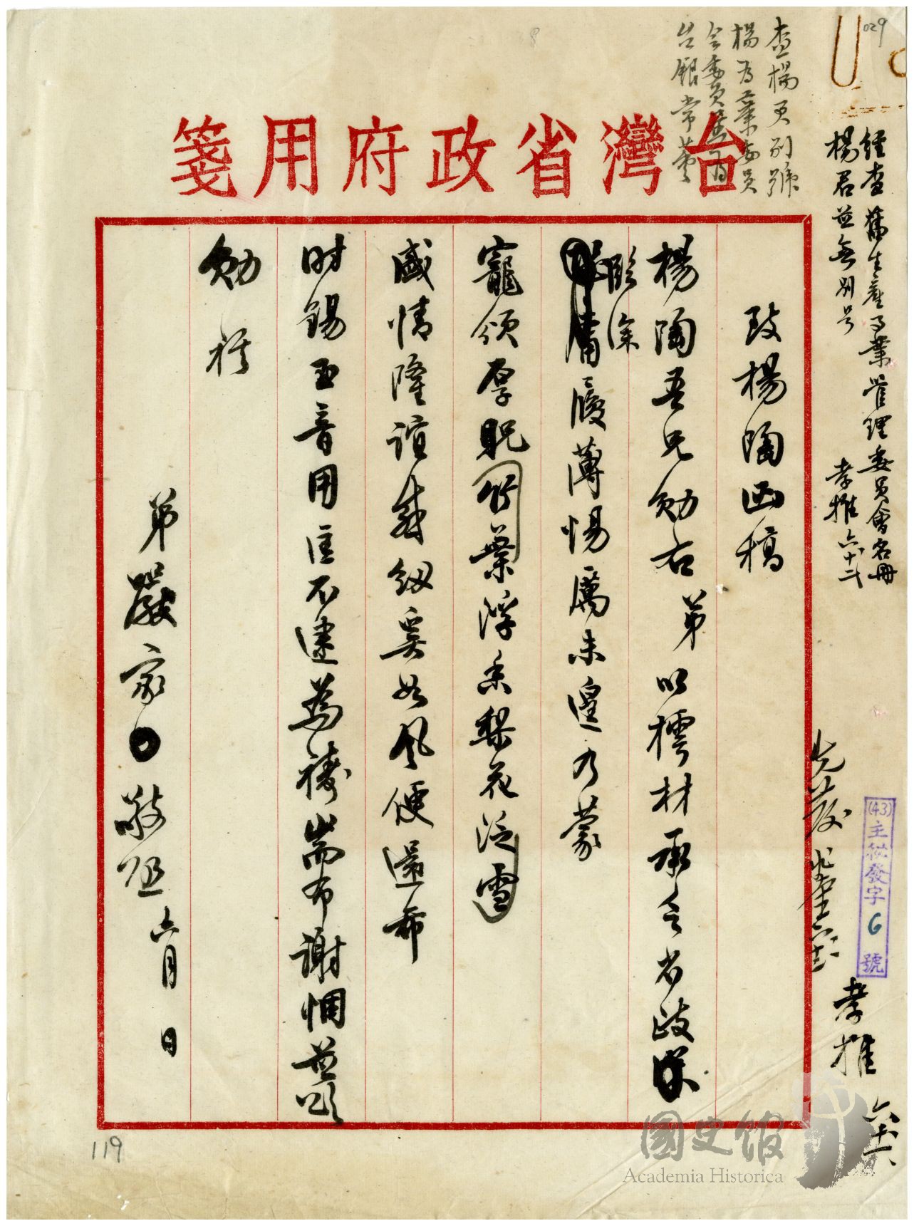 臺灣省政府主席嚴家淦函復臺灣省臨時省議會議員楊陶祝賀函