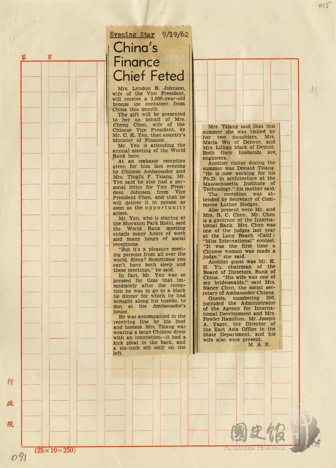 財政部長嚴家淦等參加世界銀行年會受盛宴接待報導