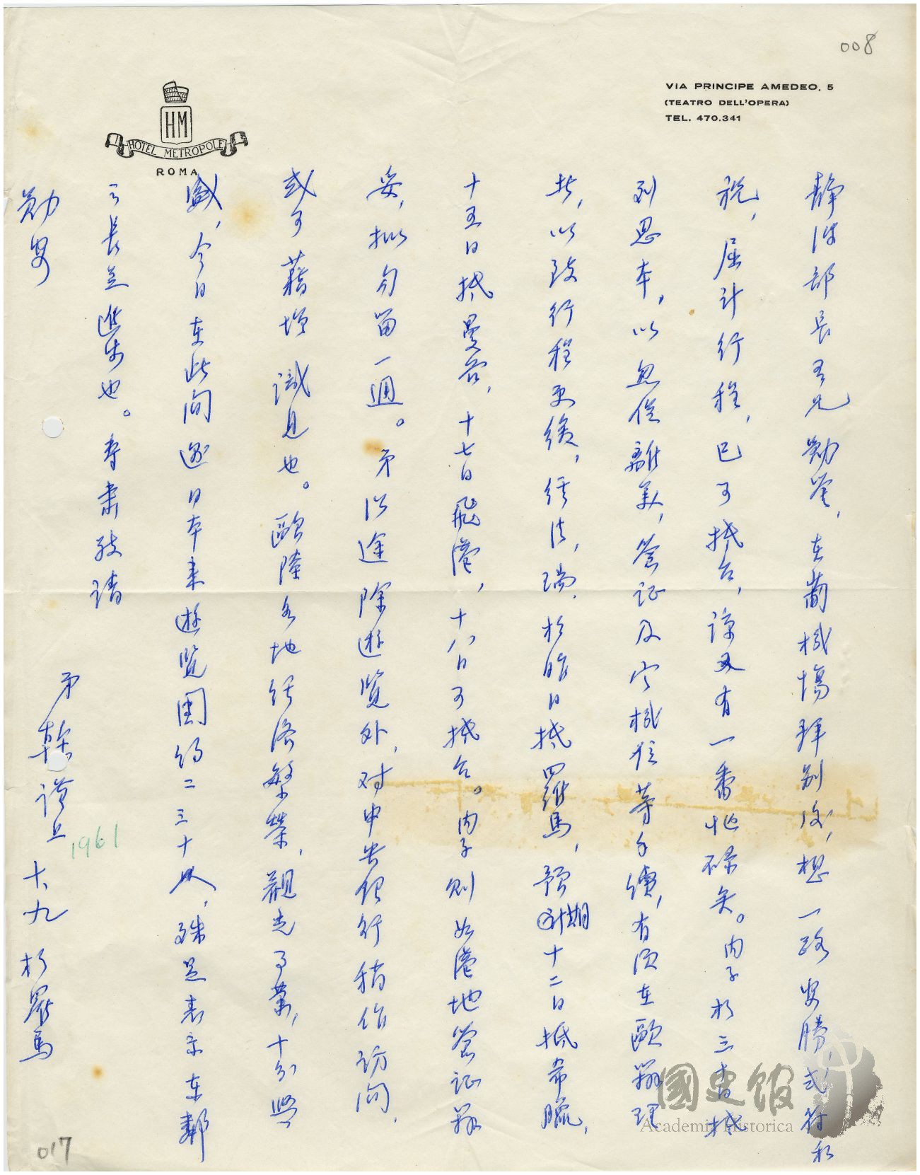中央銀行副總裁李榦函致財政部長嚴家淦說明出國行程
