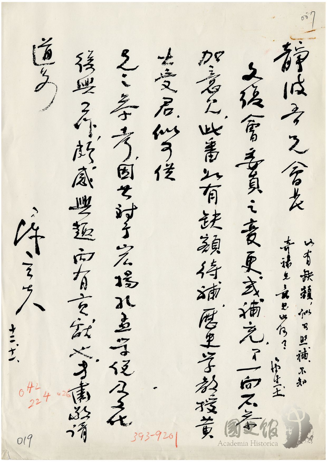 中華文化復興運動推行委員會副會長陳立夫函致會長嚴家淦推薦歷史學教授黃大受聘該會委員