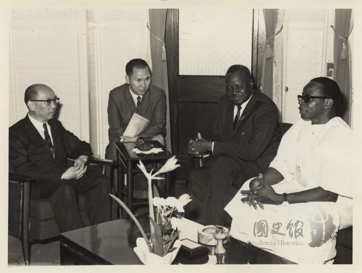 副總統兼行政院長{#嚴家淦#}接見上伏塔前任公共工程暨郵電部長{#Edward Ouedrogo(懷德哥)#}及上國總統府辦公室主任{#巴索烈#}等人