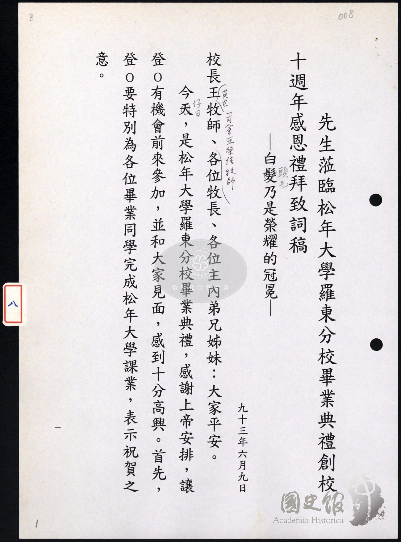 李登輝蒞臨松年大學羅東分校畢業典禮創校十週年感恩禮拜致詞─白頭毛乃是榮耀的冠冕