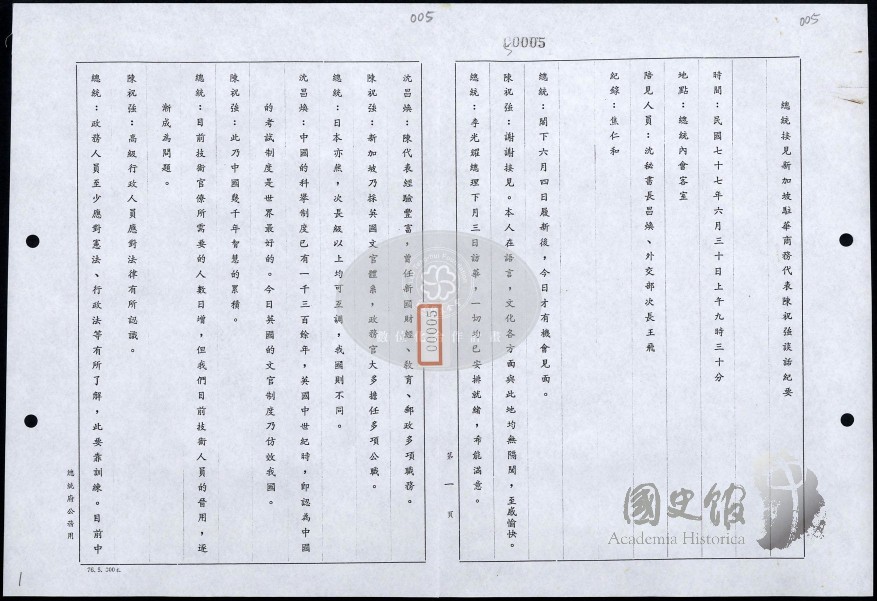 李登輝總統文物/李登輝基金會捐贈檔案史料/談話紀要/