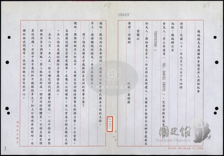 李登輝總統文物/李登輝基金會捐贈檔案史料/談話紀要/