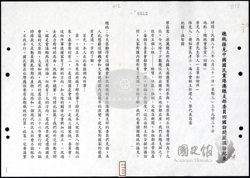 李登輝總統文物/李登輝基金會捐贈檔案史料/談話紀要/