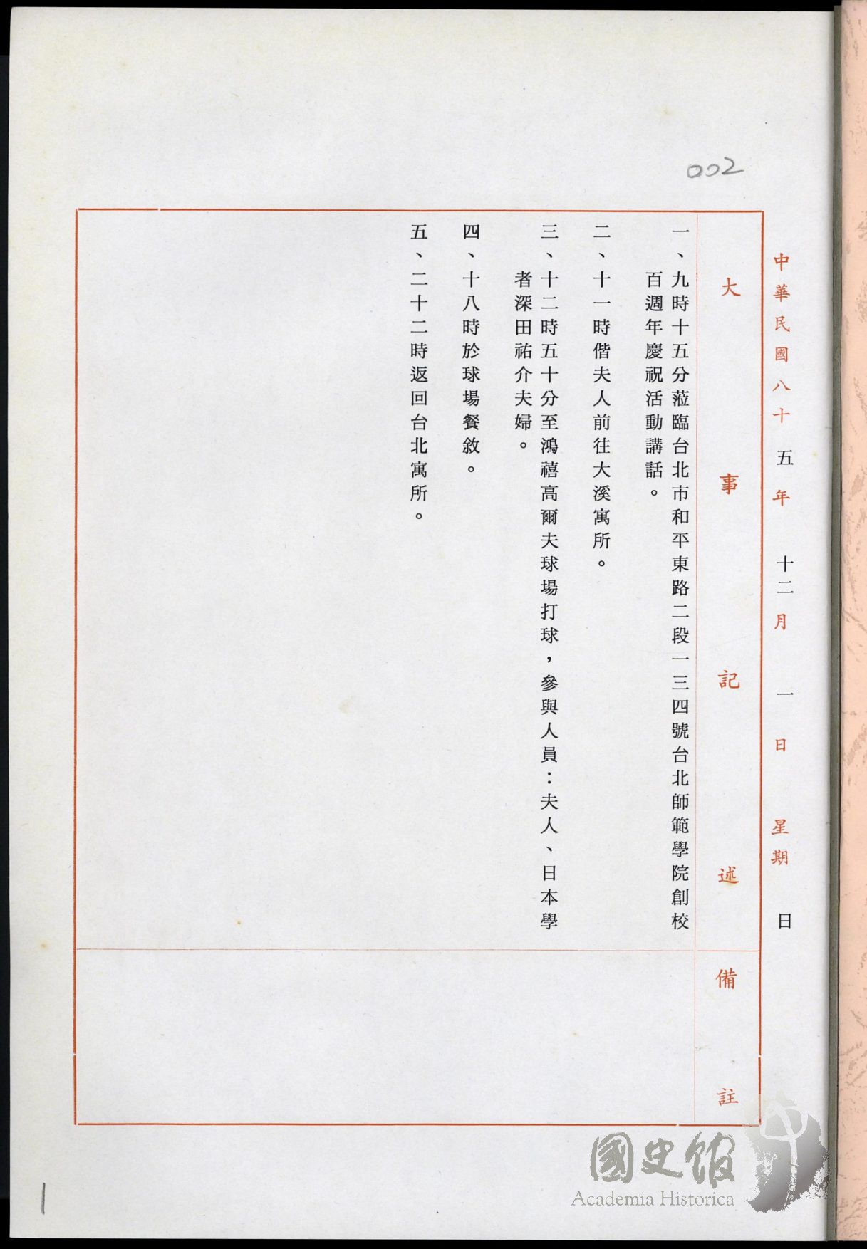 民國八十五年十二月總統李登輝參加臺北師範學院創校百週年慶祝活動等大事記述及剪報
