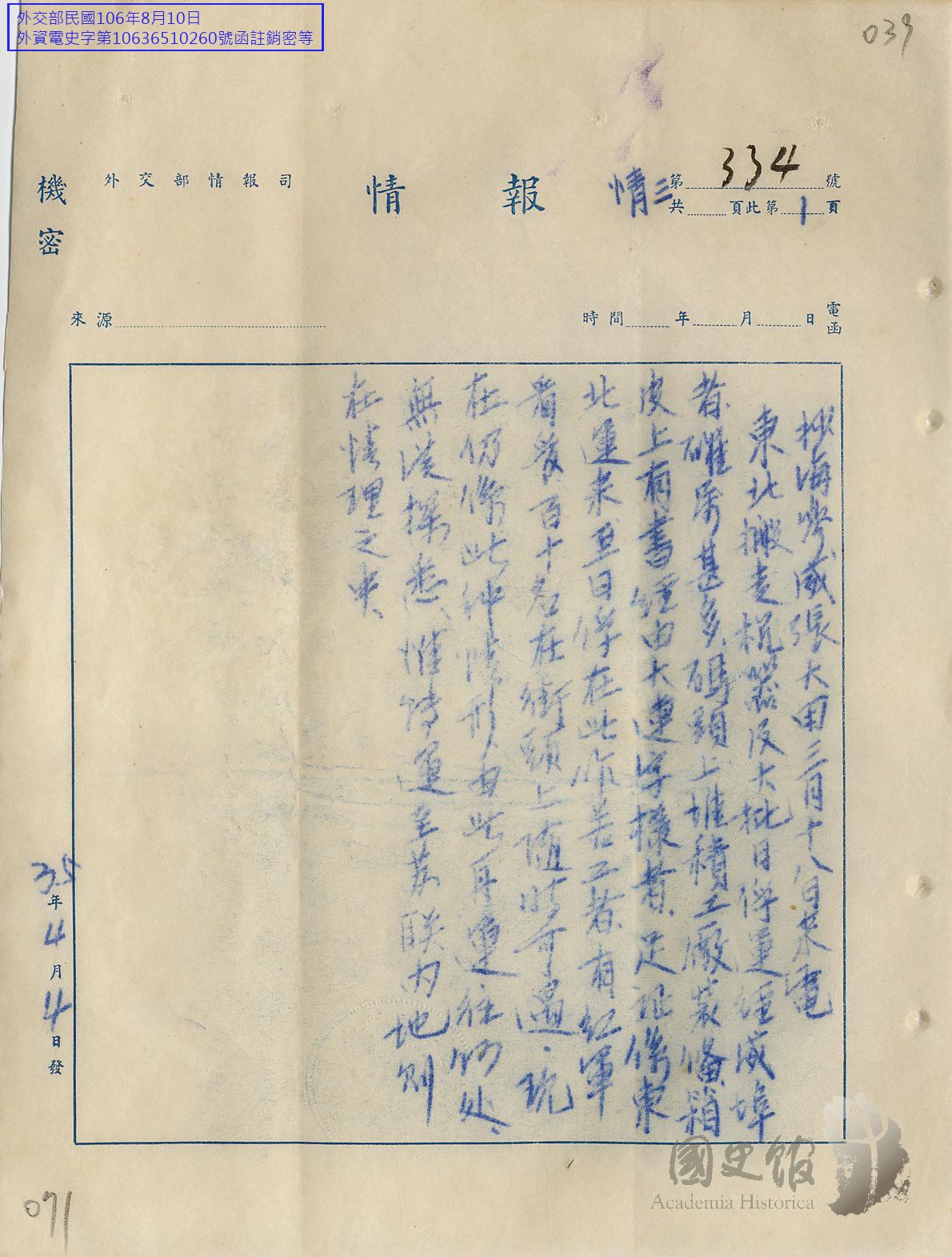 國際情勢三:抄駐海參崴總領事張大田三月十八日有關東北搬走機器及大批日俘運經海參崴者確屬甚多惟運往何處無從探悉