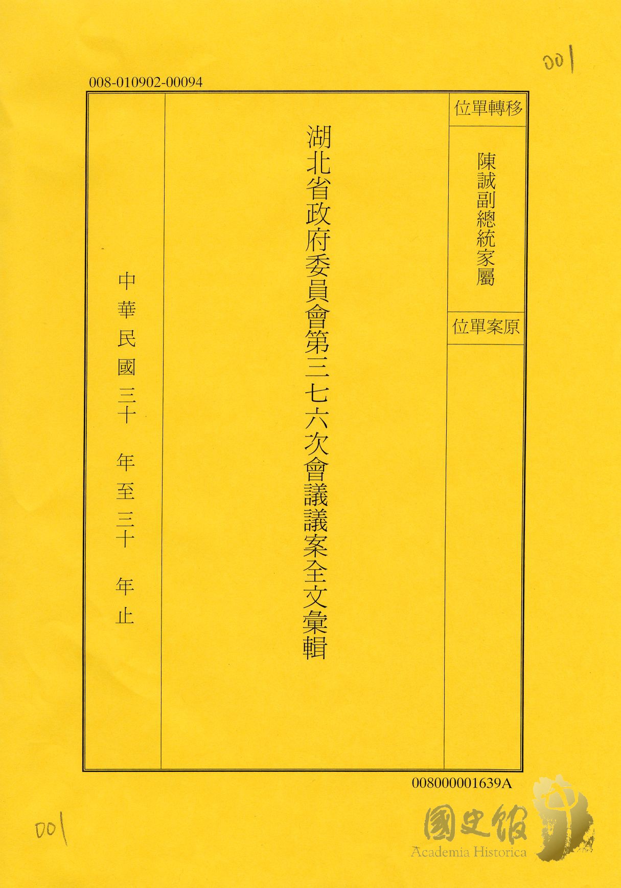 陳誠副總統文物/文件/湖北省政府/會議與紀錄