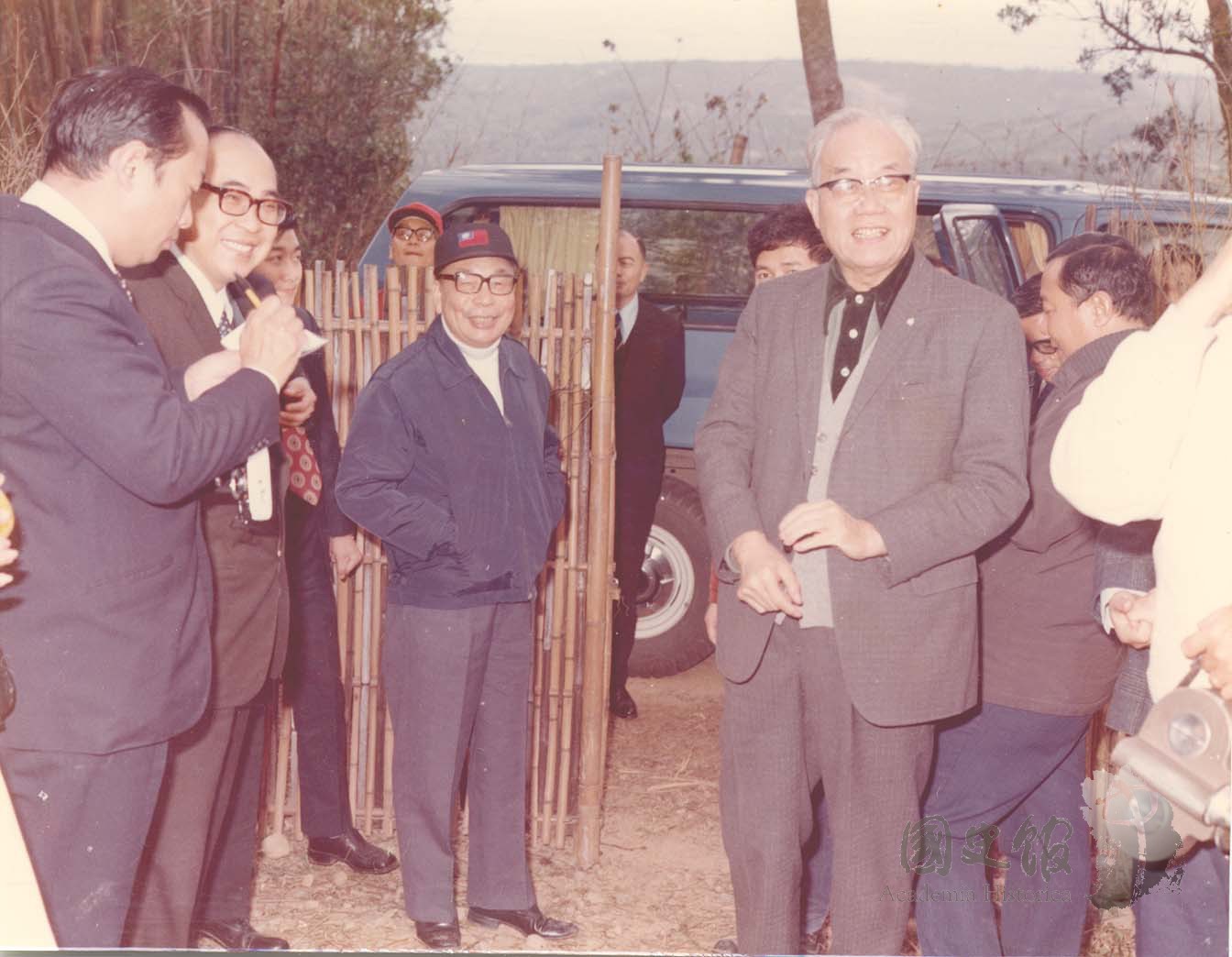 臺灣省政府主席{#謝東閔#}陪同行政院長{#蔣經國#}訪問新埔鎮{#李永火#}先生所經營柑桔茶梨園