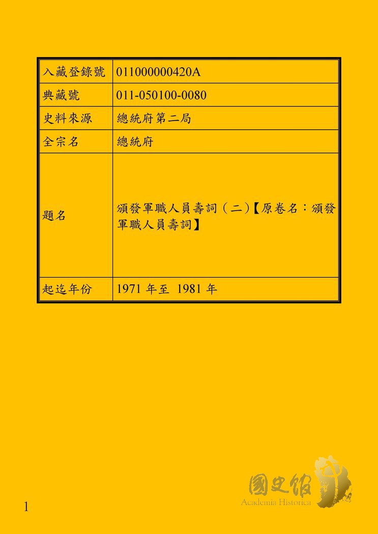 六十年第一局函詢國防部參謀總長辦公室關於謝冠生函請府內秘書長代懇總統為除役上將趙觀濤八十壽辰請褒賜壽字一案,韋永成函請秘書長代懇總統為陸軍上將李品仙八旬大壽請頒壽字,六十一年第一局奉諭函詢國防部參謀總長辦公室關於吳迺憲函請秘書長代懇總統為吳斌先生七十壽辰特賜壽字一案,六十二年董釗等函請秘書長轉陳總統為梁華盛將軍七旬華誕題頒壽字,國防部參謀總長辦公室函知府內第一局關於除役陸軍中將胡雄七秩壽慶轉懇總統賜頒壽字一案合於該部規定等