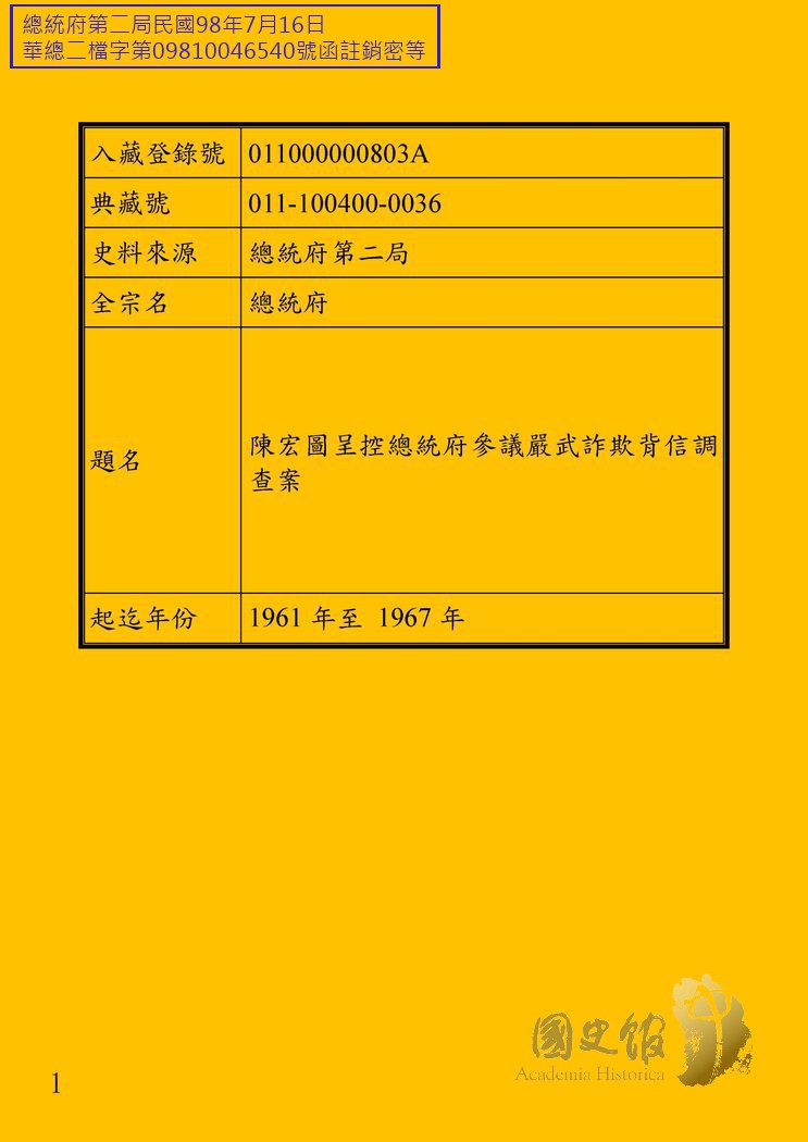 總統府人事處函高雄市警察局有關陳宏圖控府內參議利用職務詐欺背信一事請派徹查,國防部函張羣有關本府參議嚴武被控詐欺背信一案經調查屬實,陳宏圖函張羣關於總統府參議背信一案迭經呈文嚴辦迄未賜復謹請以法嚴辦,國防部函張羣關於陳宏圖控嚴武間之糾紛係屬私人似應循司法途徑解決為宜,嚴武呈蔣中正懇請畀以國間建設委員會計畫委員之任用以利建設等