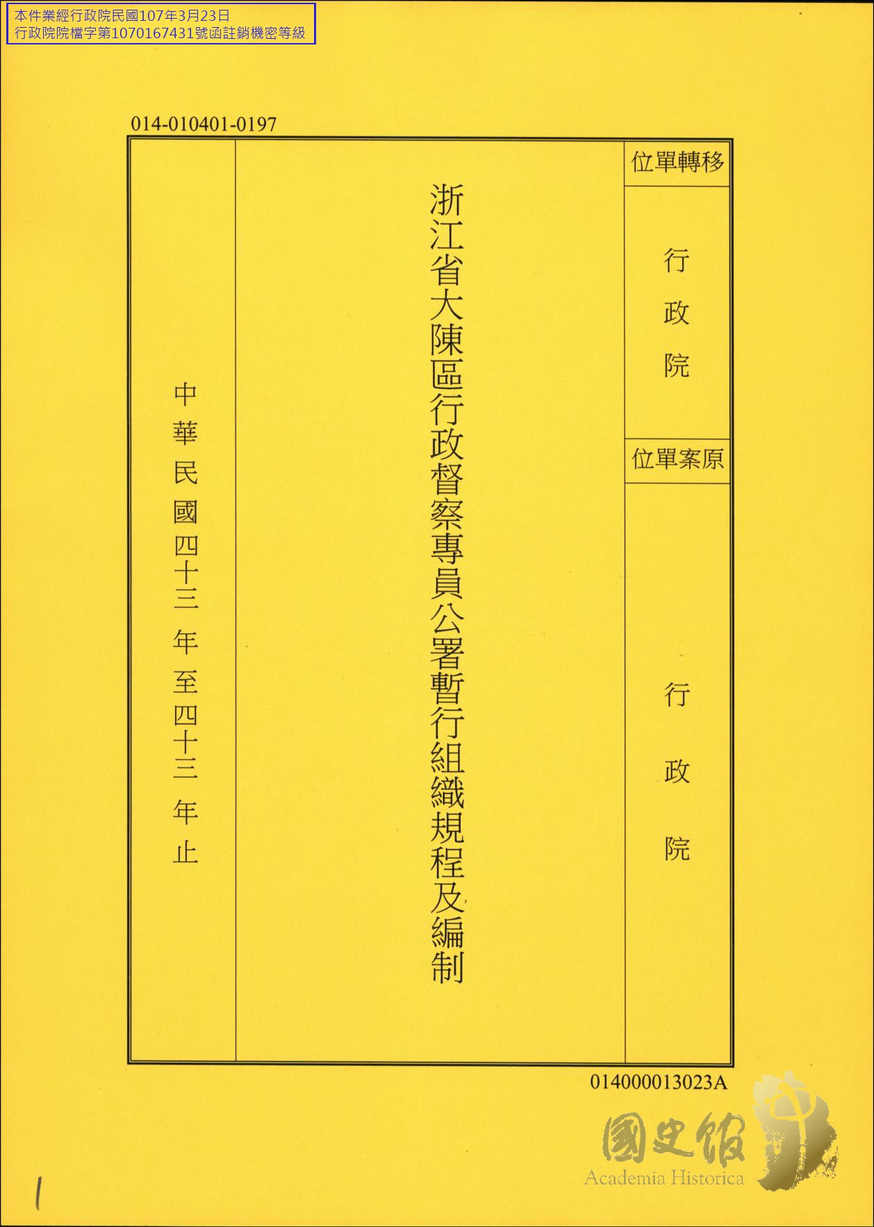 浙江省大陳區行政督察專員公署暫行組織規程及編制
