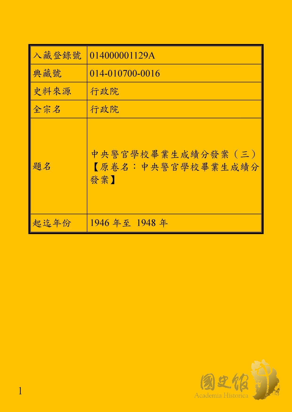 內政部呈行政院據中央警官學校呈送正科第十四期畢業學生分發名冊一案呈請鑒核備查,內政部呈行政院為呈送中央警官學校正科第十六期畢業生成績清冊及分發清冊仰祈鑒核轉呈,內政部呈行政院據中央警校呈送正科第十五期畢業學生成績冊一案呈請核轉,內政部呈行政院為辦理警校警政高等研究班第三期結業研究員分發情形簽請鑒核備案,內政部呈行政院為呈送臺警幹訓班各隊學員生卒業呈機等清冊請鑒核備查等
