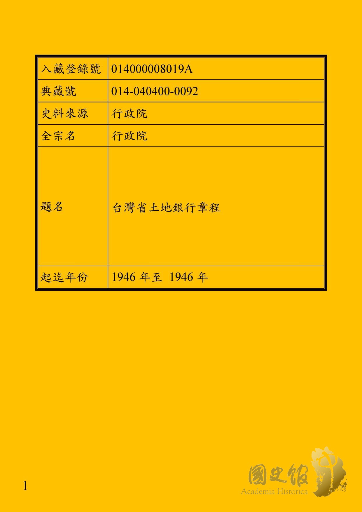 財政部呈行政院准臺灣行政長官公署送臺灣土地銀行章程請核備等由除備案外報請察核,行政院令財政部臺灣省土地銀行章程草案准予備案