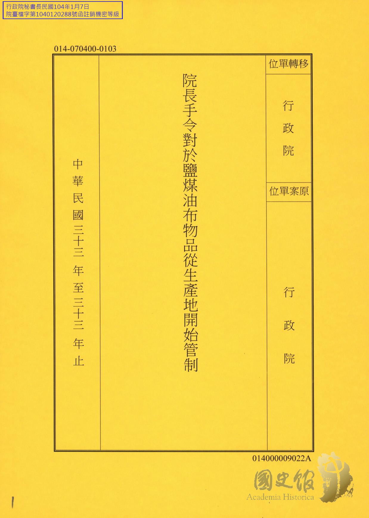 院長手令對於鹽煤油布物品從生產地開始管制