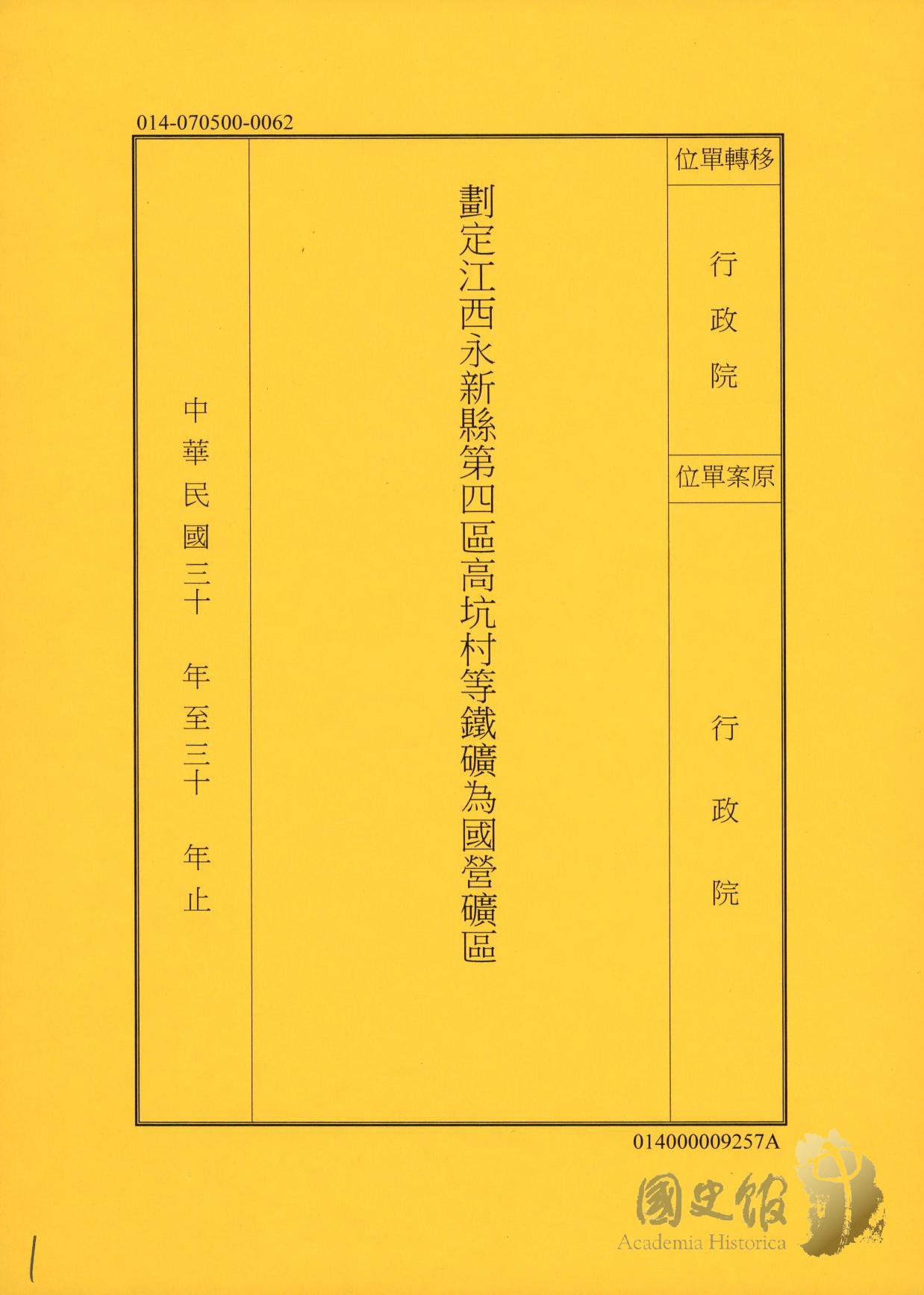 劃定江西永新縣第四區高坑村等鐵礦為國營礦區