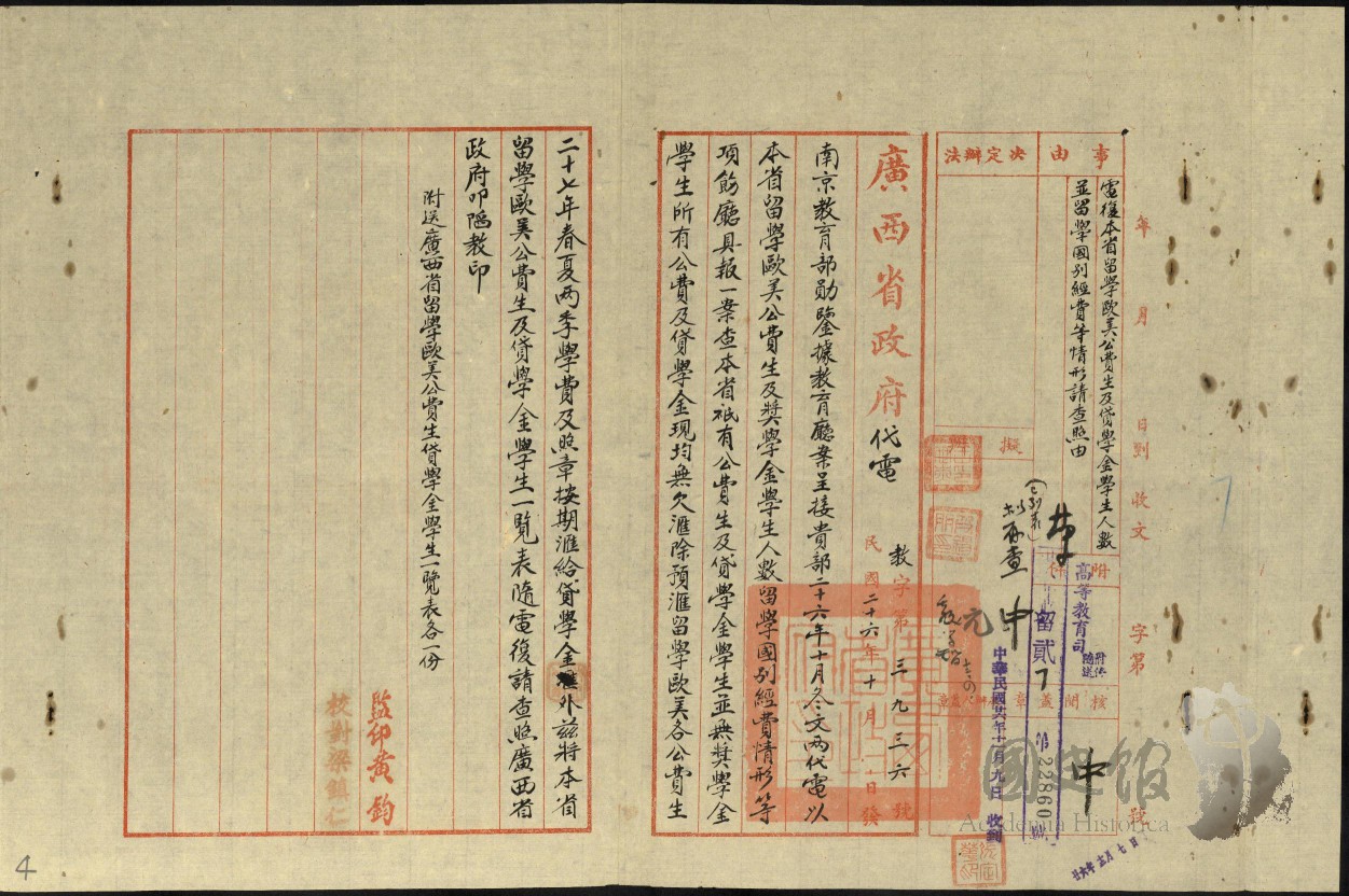 廣西省政府代電復教育部有關留學歐美公費生及貸學金學生人數並留學國別經費等情形
